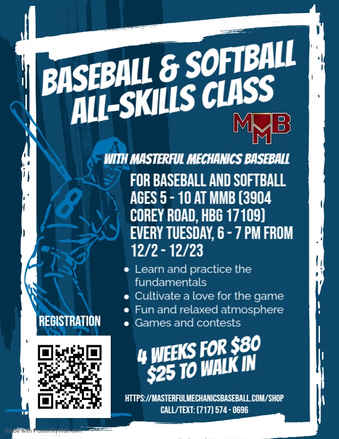 Baseball and Softball All-Skills Class Tuesdays from 12/2 to 12/23, 6 – 7 PM 4 weeks for $80 $25 to walk in