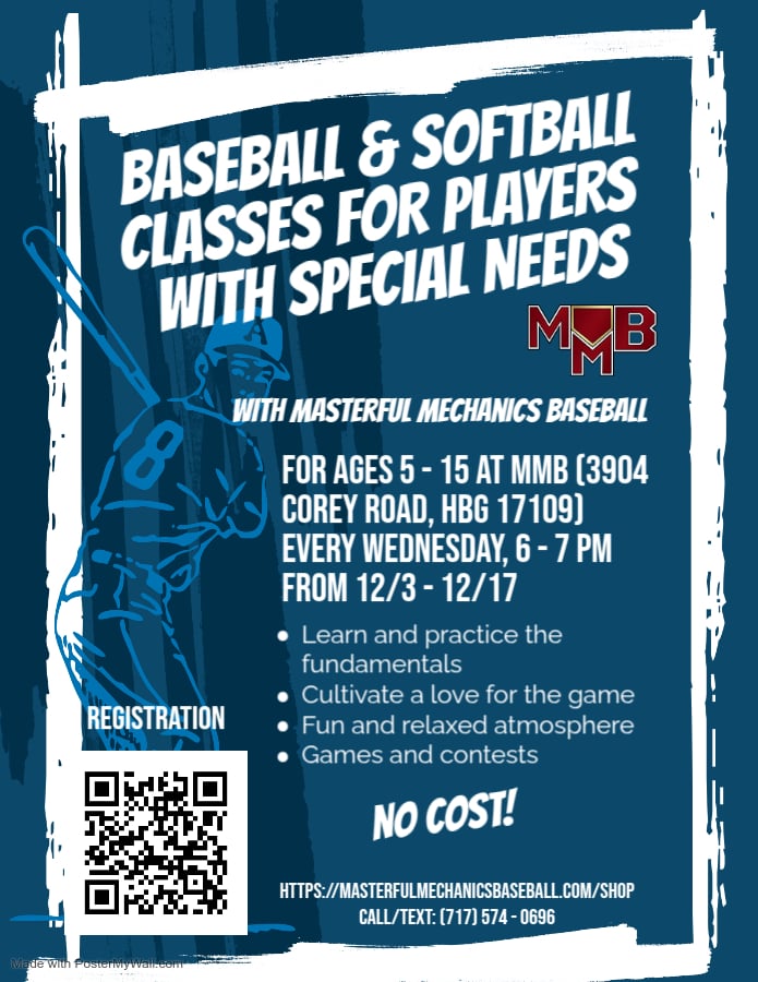Baseball and Softball Classes for Players with Special Needs Wednesdays from 12/3 to 12/17, 6 – 7 PM No cost!