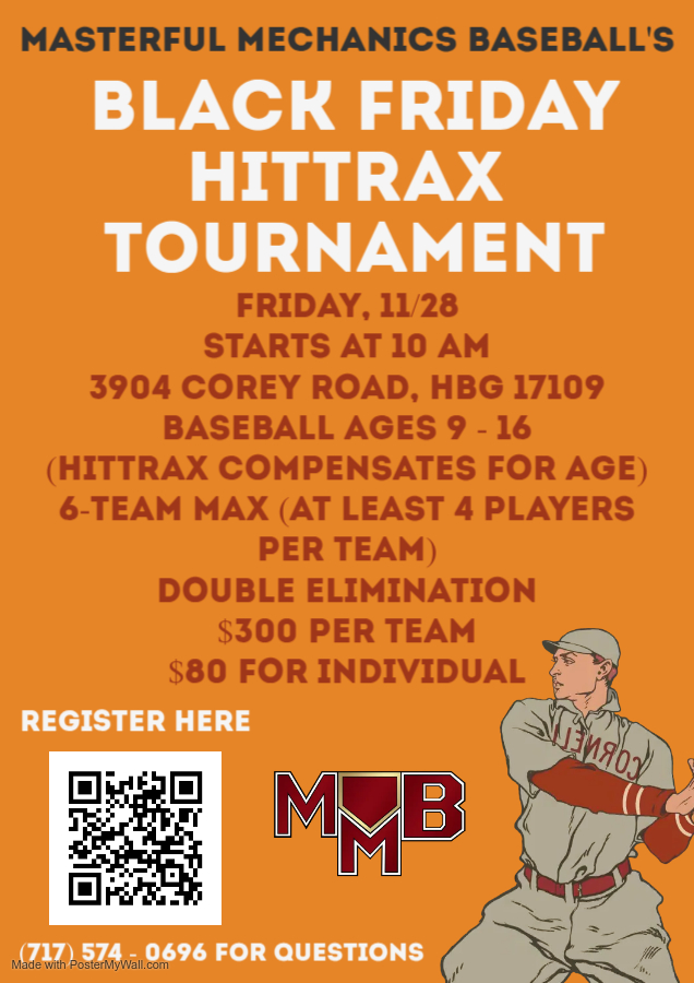 Black Friday HitTrax Tournament Friday 11/28 at 10 AM Baseball ages 9-16 $300 per team $80 for individual